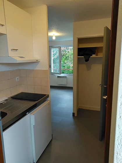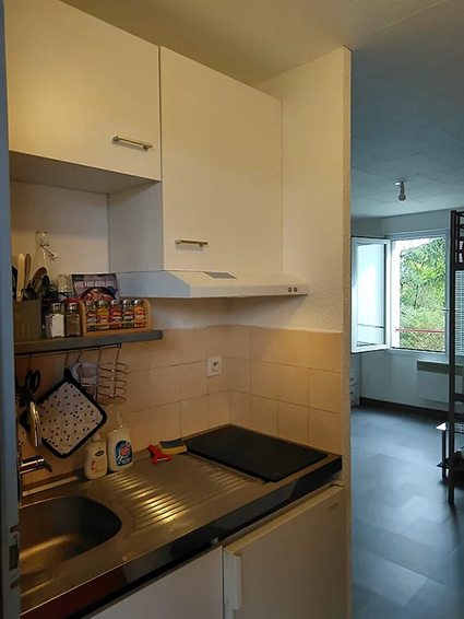 Séjour plein sud - Kitchenette réfrigérateur, plaque vitrocéramique, placard, étagères, VMC